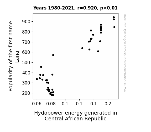 This means 84.6% of the change in the one variable (i.e., Hydopower energy generated in Central African Republic) is predictable based on the change in the other (i.e., Popularity of the first name Lana) over the 42 years from 1980 through 2021.
