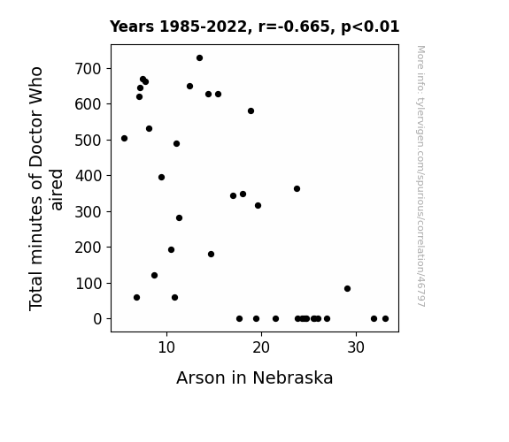 This means 44.2% of the change in the one variable (i.e., Arson in Nebraska) is predictable based on the change in the other (i.e., Total minutes of Doctor Who aired) over the 38 years from 1985 through 2022.