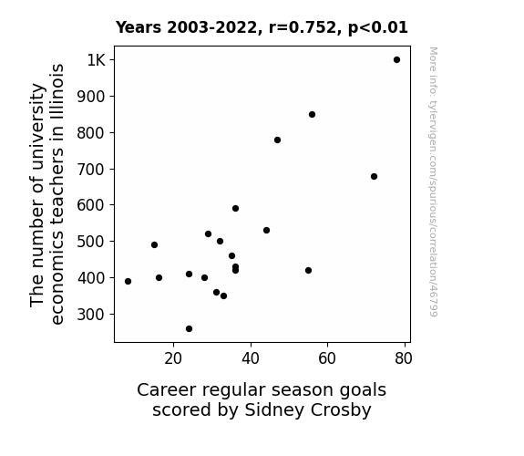 This means 56.5% of the change in the one variable (i.e., Career regular season goals scored by Sidney Crosby) is predictable based on the change in the other (i.e., The number of university economics teachers in Illinois) over the 20 years from 2003 through 2022.