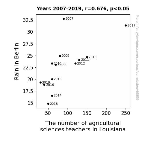 This means 45.7% of the change in the one variable (i.e., The number of agricultural sciences teachers in Louisiana) is predictable based on the change in the other (i.e., Rain in Berlin) over the 13 years from 2007 through 2019.
