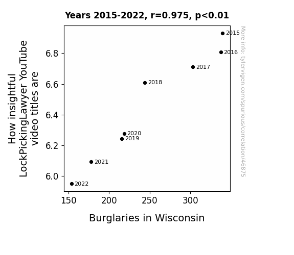 This means 95.1% of the change in the one variable (i.e., Burglaries in Wisconsin) is predictable based on the change in the other (i.e., How insightful LockPickingLawyer YouTube video titles are) over the 8 years from 2015 through 2022.