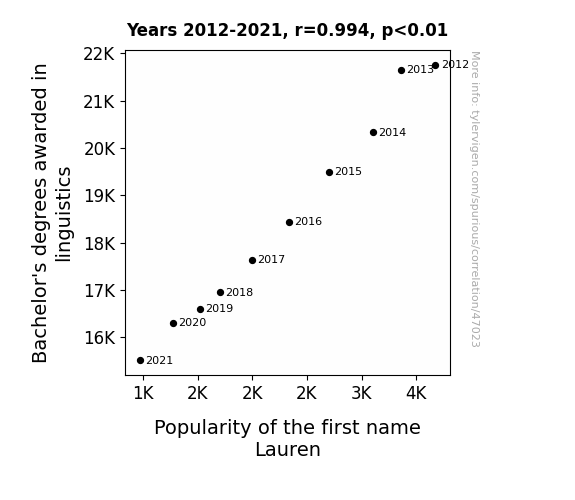 This means 98.9% of the change in the one variable (i.e., Popularity of the first name Lauren) is predictable based on the change in the other (i.e., Bachelor's degrees awarded in linguistics) over the 10 years from 2012 through 2021.