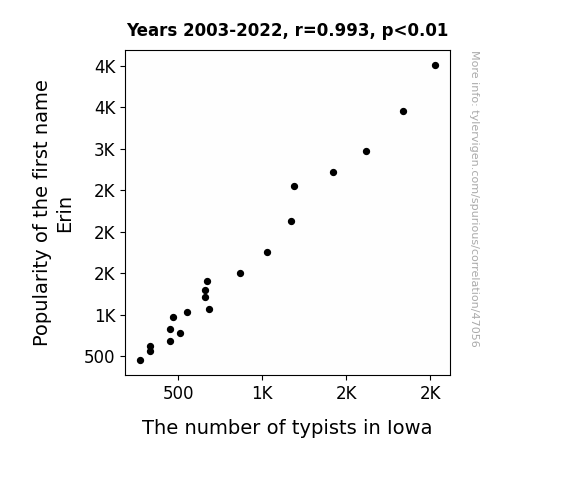 This means 98.5% of the change in the one variable (i.e., The number of typists in Iowa) is predictable based on the change in the other (i.e., Popularity of the first name Erin) over the 20 years from 2003 through 2022.