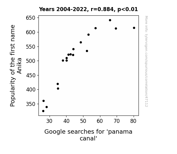 This means 78.2% of the change in the one variable (i.e., Google searches for 'panama canal') is predictable based on the change in the other (i.e., Popularity of the first name Anika) over the 19 years from 2004 through 2022.