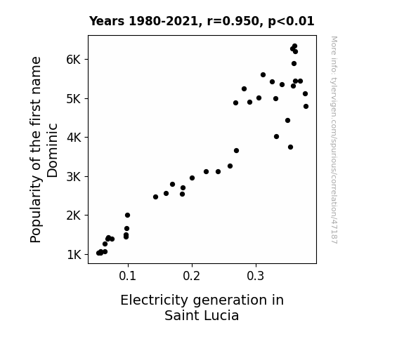This means 90.3% of the change in the one variable (i.e., Electricity generation in Saint Lucia) is predictable based on the change in the other (i.e., Popularity of the first name Dominic) over the 42 years from 1980 through 2021.