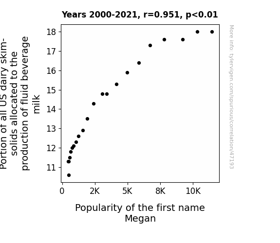This means 90.5% of the change in the one variable (i.e., Popularity of the first name Megan) is predictable based on the change in the other (i.e., Portion of all US dairy skim-solids allocated to the production of fluid beverage milk) over the 22 years from 2000 through 2021.