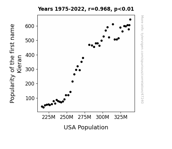 This means 93.8% of the change in the one variable (i.e., USA Population) is predictable based on the change in the other (i.e., Popularity of the first name Kieran) over the 48 years from 1975 through 2022.