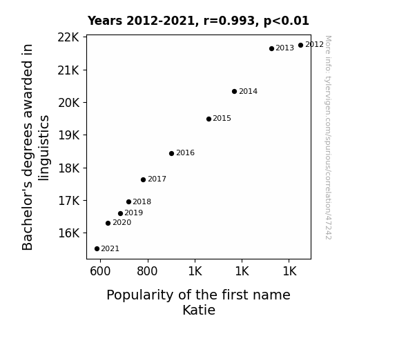 This means 98.6% of the change in the one variable (i.e., Popularity of the first name Katie) is predictable based on the change in the other (i.e., Bachelor's degrees awarded in linguistics) over the 10 years from 2012 through 2021.