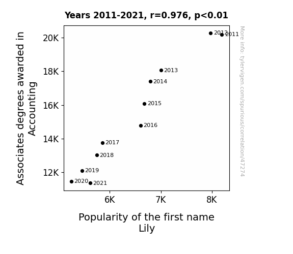This means 95.2% of the change in the one variable (i.e., Popularity of the first name Lily) is predictable based on the change in the other (i.e., Associates degrees awarded in Accounting) over the 11 years from 2011 through 2021.