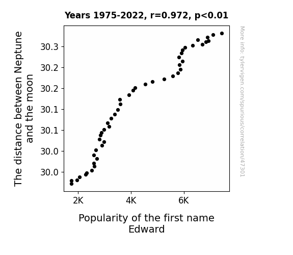 This means 94.5% of the change in the one variable (i.e., Popularity of the first name Edward) is predictable based on the change in the other (i.e., The distance between Neptune and the moon) over the 48 years from 1975 through 2022.