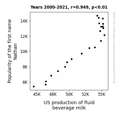 This means 90% of the change in the one variable (i.e., US production of fluid beverage milk) is predictable based on the change in the other (i.e., Popularity of the first name Nathan) over the 22 years from 2000 through 2021.