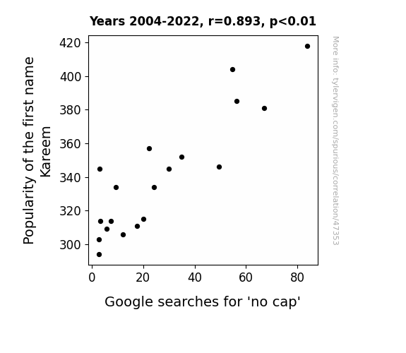 This means 79.7% of the change in the one variable (i.e., Google searches for 'no cap') is predictable based on the change in the other (i.e., Popularity of the first name Kareem) over the 19 years from 2004 through 2022.