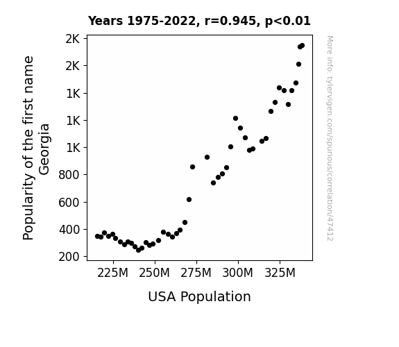 This means 89.3% of the change in the one variable (i.e., USA Population) is predictable based on the change in the other (i.e., Popularity of the first name Georgia) over the 48 years from 1975 through 2022.