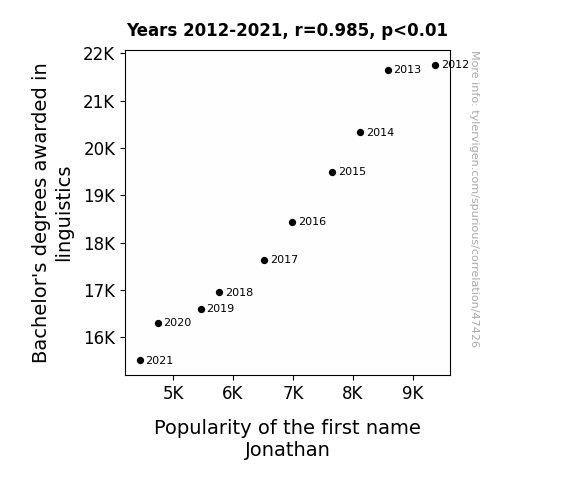 This means 97% of the change in the one variable (i.e., Popularity of the first name Jonathan) is predictable based on the change in the other (i.e., Bachelor's degrees awarded in linguistics) over the 10 years from 2012 through 2021.