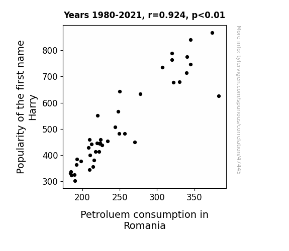 This means 85.3% of the change in the one variable (i.e., Petroluem consumption in Romania) is predictable based on the change in the other (i.e., Popularity of the first name Harry) over the 42 years from 1980 through 2021.
