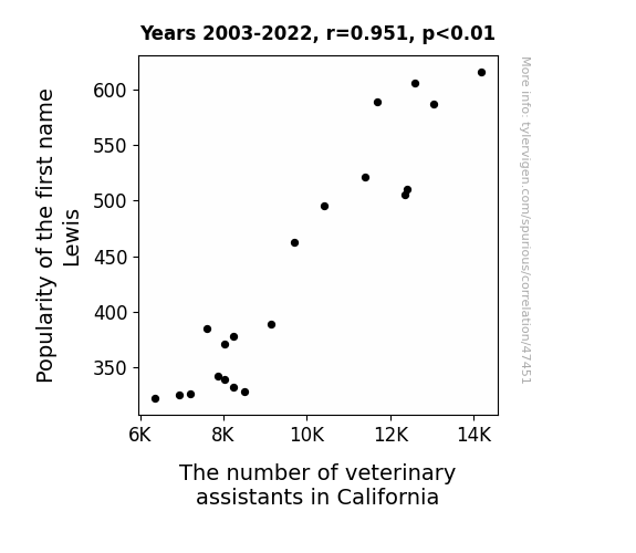 This means 90.4% of the change in the one variable (i.e., The number of veterinary assistants in California) is predictable based on the change in the other (i.e., Popularity of the first name Lewis) over the 20 years from 2003 through 2022.