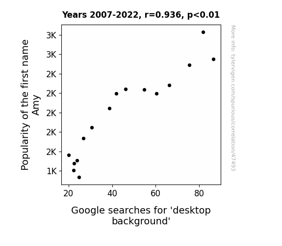 This means 87.5% of the change in the one variable (i.e., Google searches for 'desktop background') is predictable based on the change in the other (i.e., Popularity of the first name Amy) over the 16 years from 2007 through 2022.