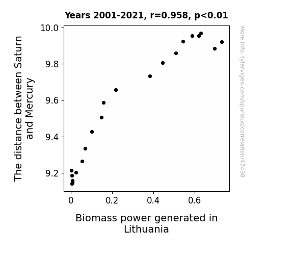 This means 91.8% of the change in the one variable (i.e., Biomass power generated in Lithuania) is predictable based on the change in the other (i.e., The distance between Saturn and Mercury) over the 21 years from 2001 through 2021.