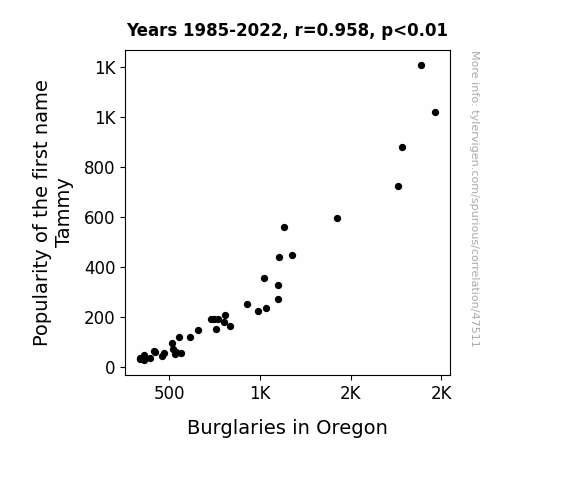 This means 91.8% of the change in the one variable (i.e., Burglaries in Oregon) is predictable based on the change in the other (i.e., Popularity of the first name Tammy) over the 38 years from 1985 through 2022.