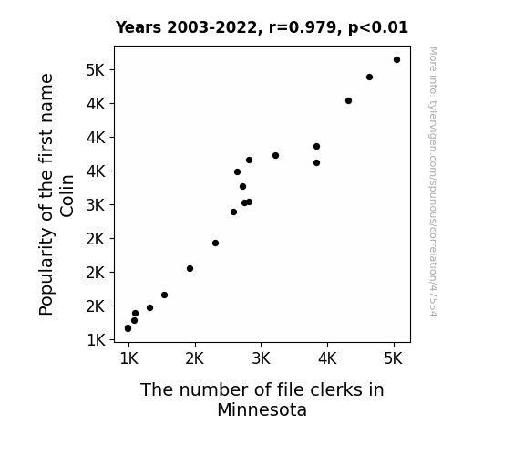 This means 95.9% of the change in the one variable (i.e., The number of file clerks in Minnesota) is predictable based on the change in the other (i.e., Popularity of the first name Colin) over the 20 years from 2003 through 2022.