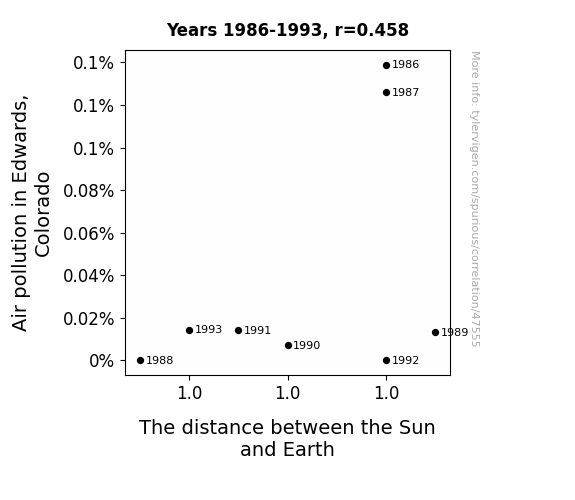 This means 21% of the change in the one variable (i.e., The distance between the Sun and Earth) is predictable based on the change in the other (i.e., Air pollution in Edwards, Colorado) over the 8 years from 1986 through 1993.