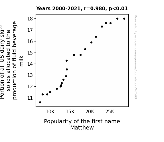 This means 96.1% of the change in the one variable (i.e., Popularity of the first name Matthew) is predictable based on the change in the other (i.e., Portion of all US dairy skim-solids allocated to the production of fluid beverage milk) over the 22 years from 2000 through 2021.