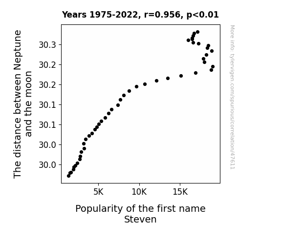 This means 91.3% of the change in the one variable (i.e., Popularity of the first name Steven) is predictable based on the change in the other (i.e., The distance between Neptune and the moon) over the 48 years from 1975 through 2022.