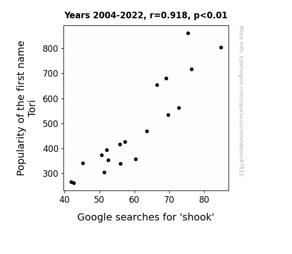 This means 84.3% of the change in the one variable (i.e., Google searches for 'shook') is predictable based on the change in the other (i.e., Popularity of the first name Tori) over the 19 years from 2004 through 2022.