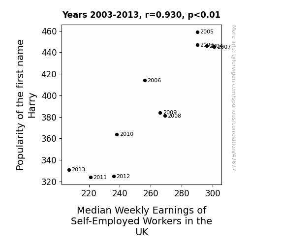 This means 86.4% of the change in the one variable (i.e., Median Weekly Earnings of Self-Employed Workers in the UK) is predictable based on the change in the other (i.e., Popularity of the first name Harry) over the 11 years from 2003 through 2013.
