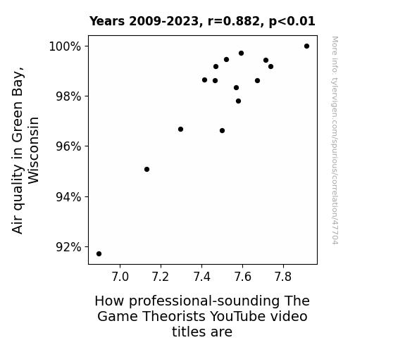 This means 77.8% of the change in the one variable (i.e., How professional-sounding The Game Theorists YouTube video titles are) is predictable based on the change in the other (i.e., Air quality in Green Bay, Wisconsin) over the 15 years from 2009 through 2023.
