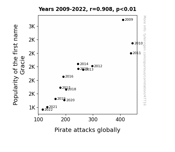 This means 82.4% of the change in the one variable (i.e., Pirate attacks globally) is predictable based on the change in the other (i.e., Popularity of the first name Gracie) over the 14 years from 2009 through 2022.