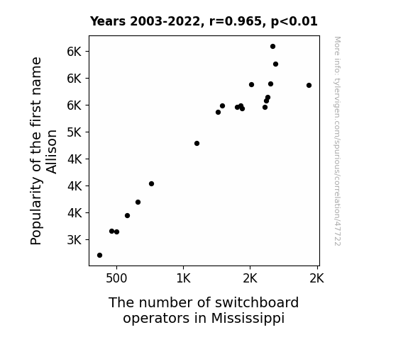 This means 93.2% of the change in the one variable (i.e., The number of switchboard operators in Mississippi) is predictable based on the change in the other (i.e., Popularity of the first name Allison) over the 20 years from 2003 through 2022.