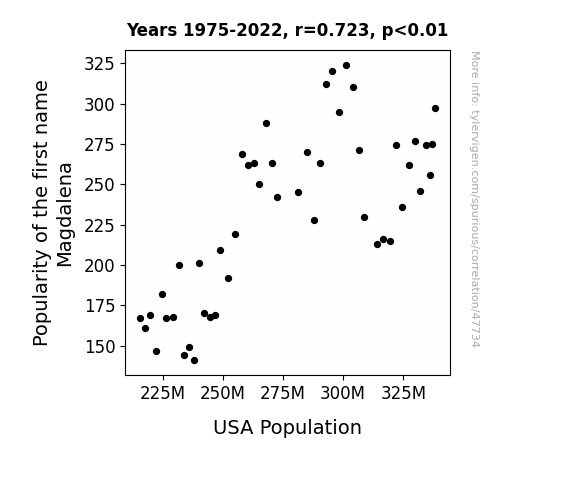 This means 52.3% of the change in the one variable (i.e., USA Population) is predictable based on the change in the other (i.e., Popularity of the first name Magdalena) over the 48 years from 1975 through 2022.