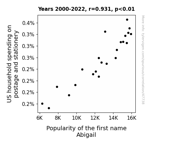 This means 86.6% of the change in the one variable (i.e., Popularity of the first name Abigail) is predictable based on the change in the other (i.e., US household spending on postage and stationery) over the 23 years from 2000 through 2022.