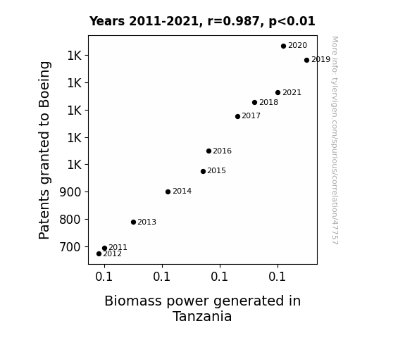 This means 97.4% of the change in the one variable (i.e., Biomass power generated in Tanzania) is predictable based on the change in the other (i.e., Patents granted to Boeing) over the 11 years from 2011 through 2021.