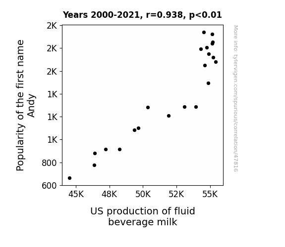 This means 87.9% of the change in the one variable (i.e., US production of fluid beverage milk) is predictable based on the change in the other (i.e., Popularity of the first name Andy) over the 22 years from 2000 through 2021.