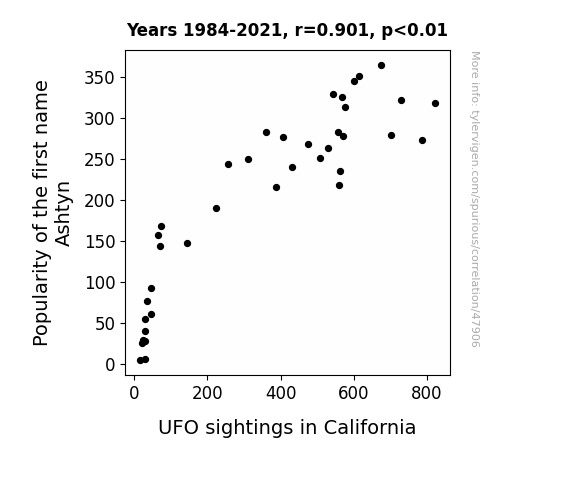 This means 81.1% of the change in the one variable (i.e., UFO sightings in California) is predictable based on the change in the other (i.e., Popularity of the first name Ashtyn) over the 38 years from 1984 through 2021.