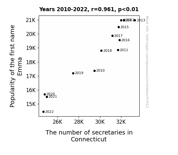This means 92.3% of the change in the one variable (i.e., The number of secretaries in Connecticut) is predictable based on the change in the other (i.e., Popularity of the first name Emma) over the 13 years from 2010 through 2022.