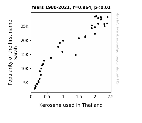 This means 92.8% of the change in the one variable (i.e., Kerosene used in Thailand) is predictable based on the change in the other (i.e., Popularity of the first name Sarah) over the 42 years from 1980 through 2021.