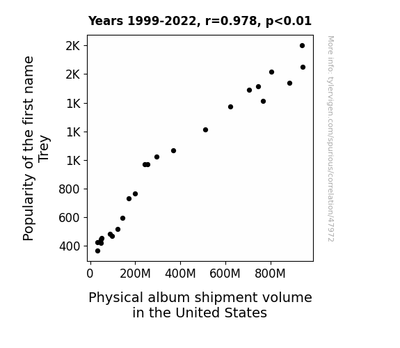 This means 95.7% of the change in the one variable (i.e., Physical album shipment volume in the United States) is predictable based on the change in the other (i.e., Popularity of the first name Trey) over the 24 years from 1999 through 2022.