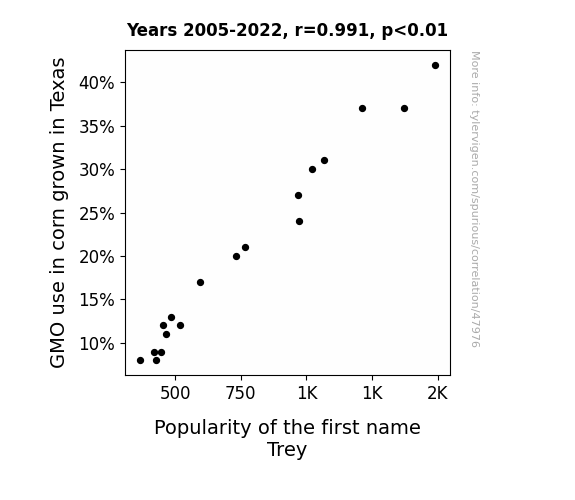 This means 98.1% of the change in the one variable (i.e., Popularity of the first name Trey) is predictable based on the change in the other (i.e., GMO use in corn grown in Texas) over the 18 years from 2005 through 2022.