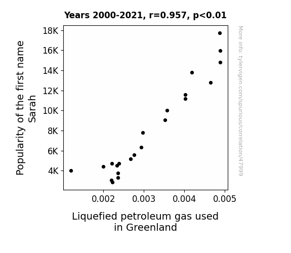 This means 91.6% of the change in the one variable (i.e., Liquefied petroleum gas used in Greenland) is predictable based on the change in the other (i.e., Popularity of the first name Sarah) over the 22 years from 2000 through 2021.