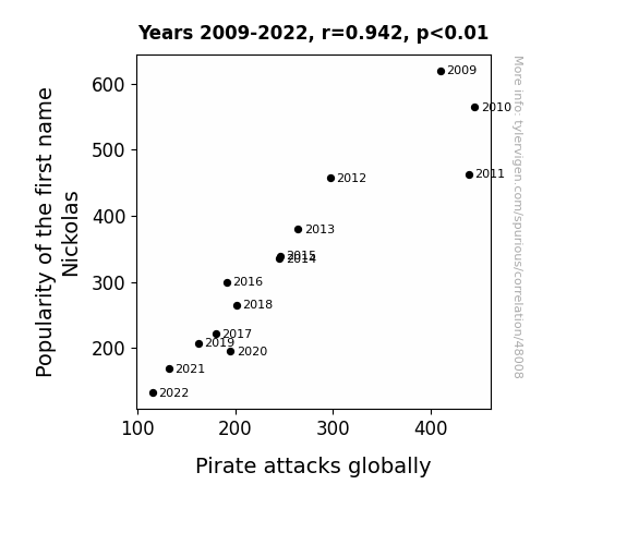 This means 88.8% of the change in the one variable (i.e., Pirate attacks globally) is predictable based on the change in the other (i.e., Popularity of the first name Nickolas) over the 14 years from 2009 through 2022.