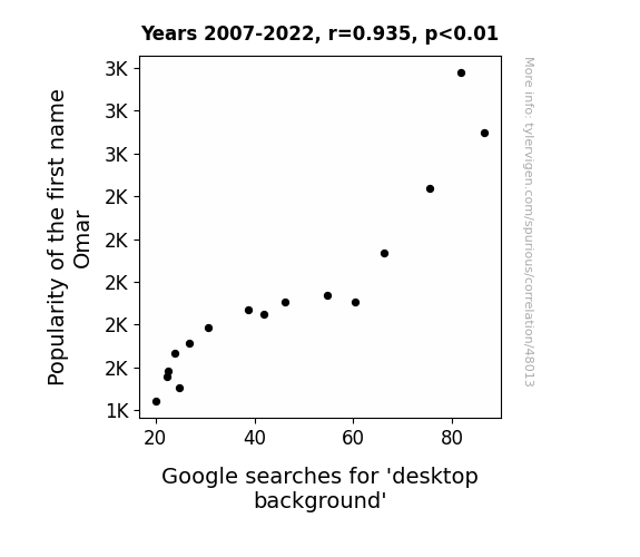 This means 87.5% of the change in the one variable (i.e., Google searches for 'desktop background') is predictable based on the change in the other (i.e., Popularity of the first name Omar) over the 16 years from 2007 through 2022.