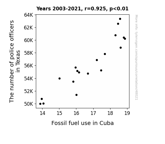 This means 85.6% of the change in the one variable (i.e., Fossil fuel use in Cuba) is predictable based on the change in the other (i.e., The number of police officers in Texas) over the 19 years from 2003 through 2021.