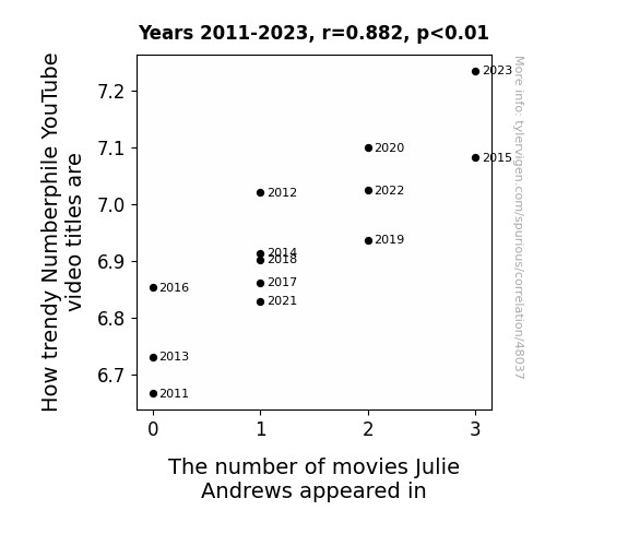 This means 77.8% of the change in the one variable (i.e., The number of movies Julie Andrews appeared in) is predictable based on the change in the other (i.e., How trendy Numberphile YouTube video titles are) over the 13 years from 2011 through 2023.