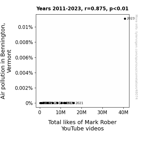 This means 76.6% of the change in the one variable (i.e., Total likes of Mark Rober YouTube videos) is predictable based on the change in the other (i.e., Air pollution in Bennington, Vermont) over the 13 years from 2011 through 2023.