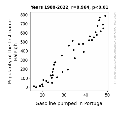 This means 93% of the change in the one variable (i.e., Gasoline pumped in Portugal) is predictable based on the change in the other (i.e., Popularity of the first name Haleigh) over the 43 years from 1980 through 2022.
