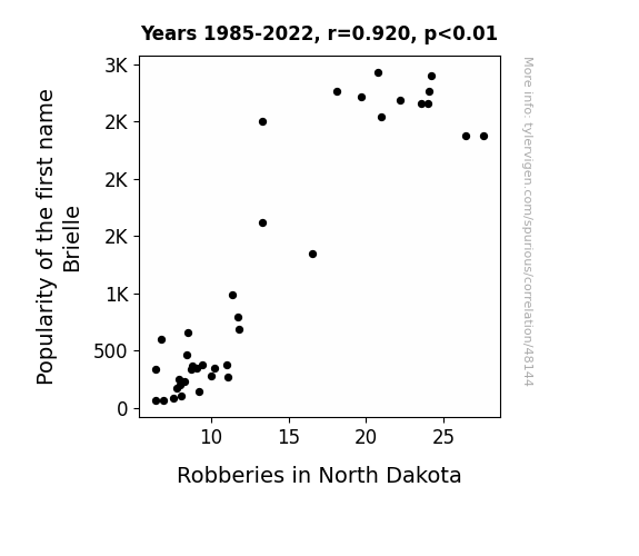 This means 84.6% of the change in the one variable (i.e., Robberies in North Dakota) is predictable based on the change in the other (i.e., Popularity of the first name Brielle) over the 38 years from 1985 through 2022.