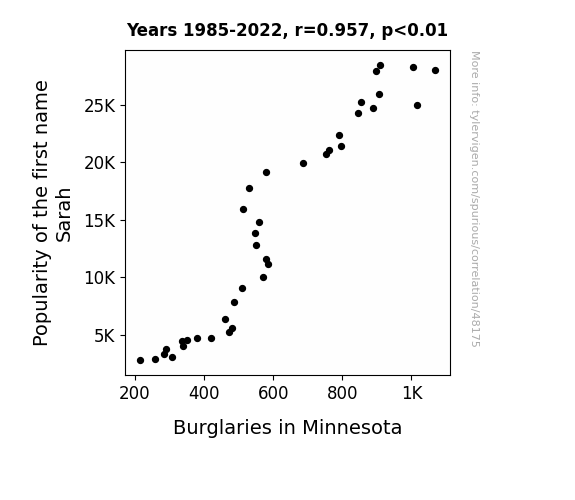 This means 91.6% of the change in the one variable (i.e., Burglaries in Minnesota) is predictable based on the change in the other (i.e., Popularity of the first name Sarah) over the 38 years from 1985 through 2022.